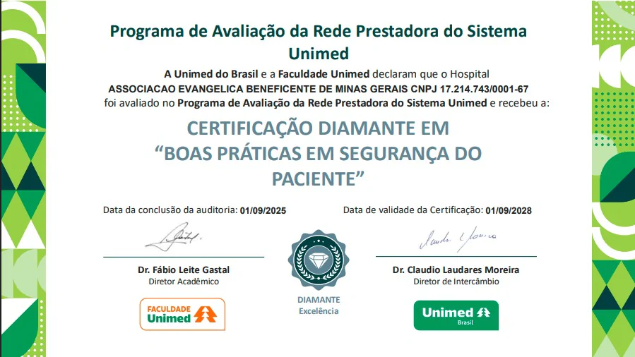 O Hospital alcançou a classificação diamante no Programa de Avaliação da rede Prestadora do Sistema Unimed – MGHOSP, com 97,91% de conformidade nos processos de “Boas Práticas em Segurança do Paciente”