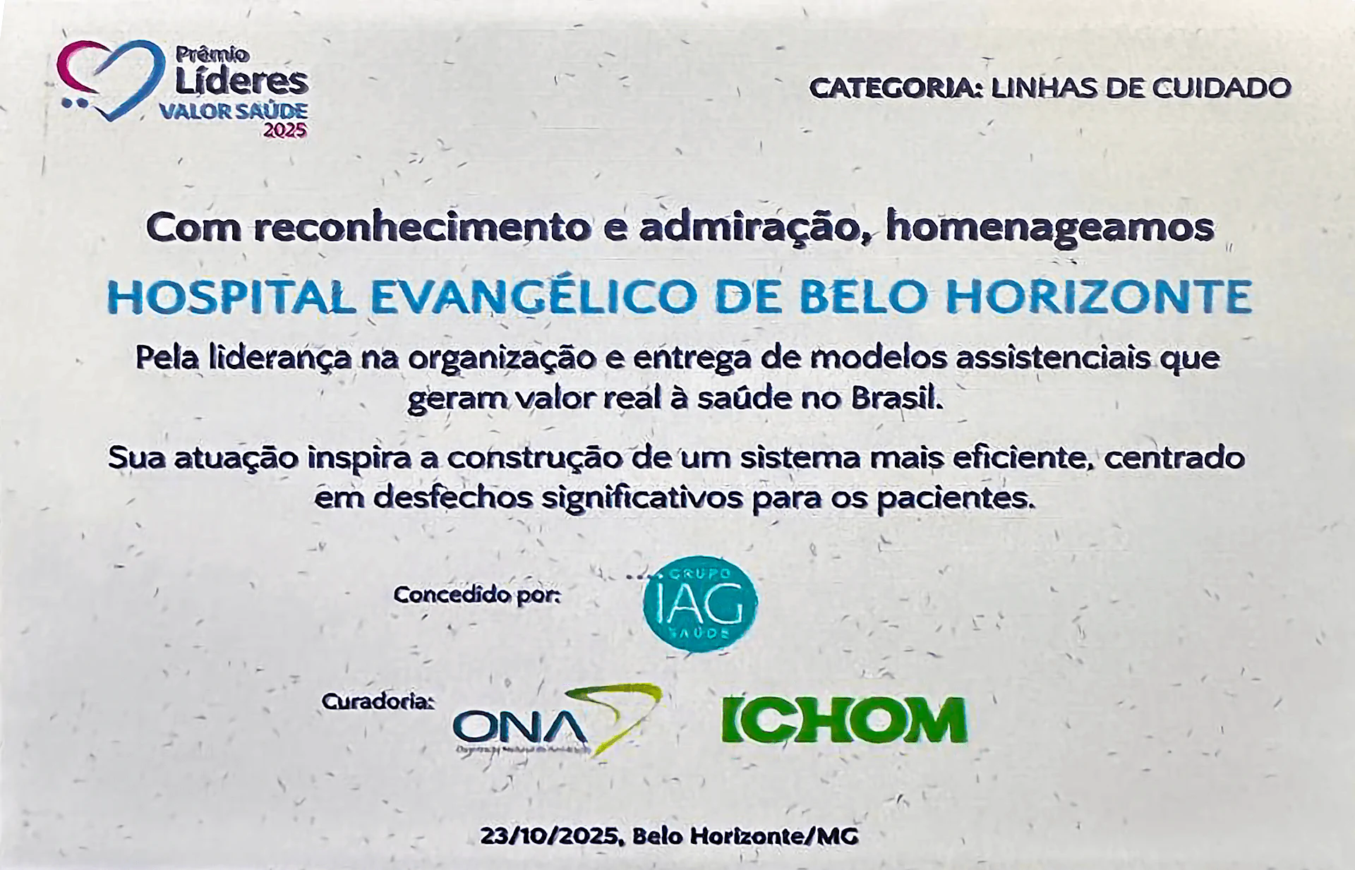 O Hospital Evangélico de Belo Horizonte foi reconhecido como Líder na Entrega de Valor em Saúde – Edição 2025, premiação do Grupo IAG Saúde, com curadoria da ONA e do ICHOM.